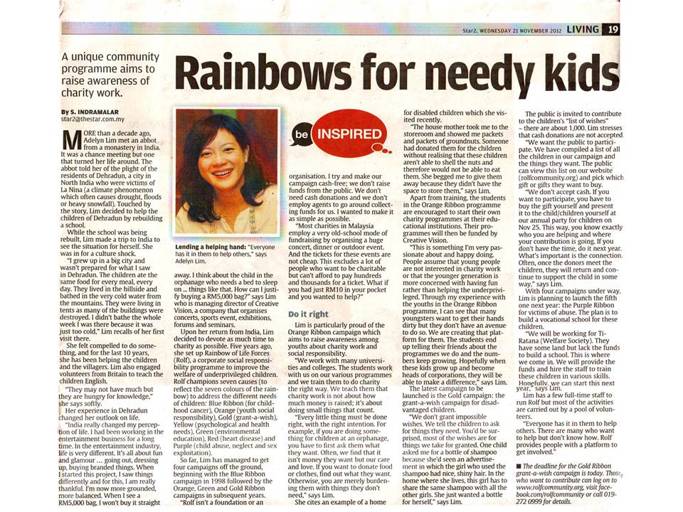 By supporting ROLF campaign, the real beneficiary is me because when I try to touch the hearts of the children, it is my own heart that is being touched by these children. I’m pledging my support to the Gold Ribbon Campaign.